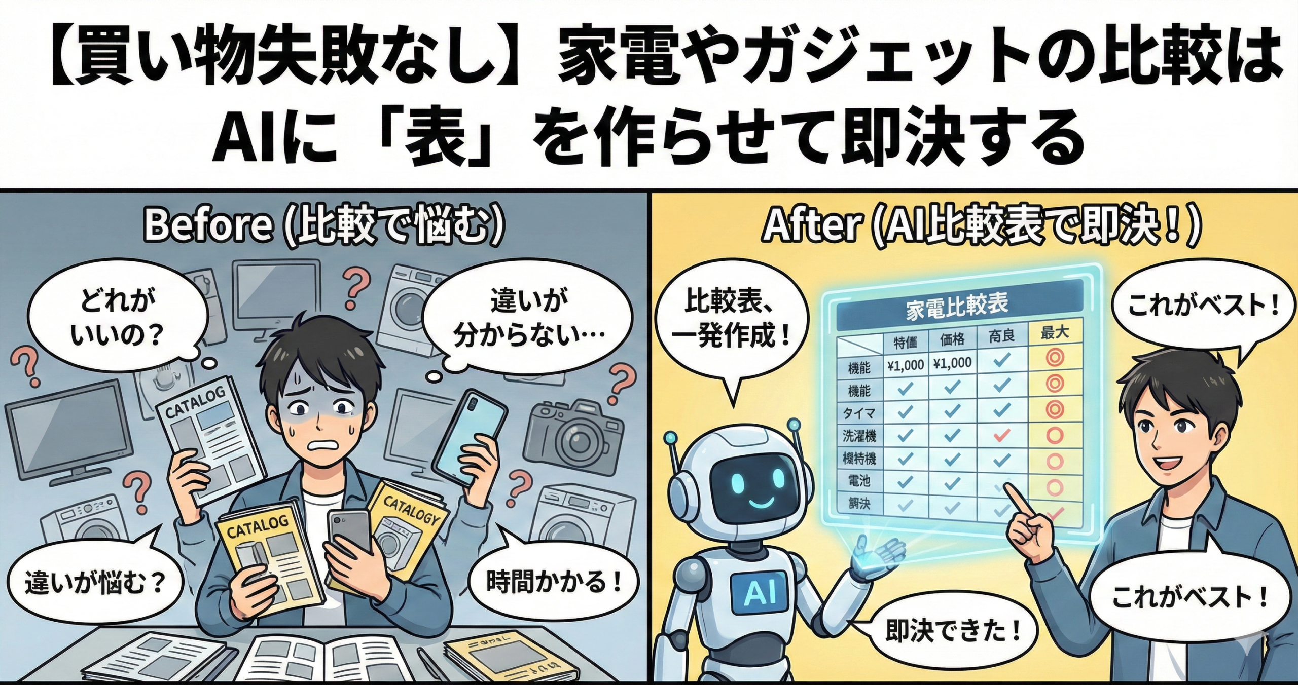 AIに面倒なスペック比較を丸投げし、見やすい「比較表」を作らせて、納得のいく買い物を「即決」するテクニックをご紹介します。